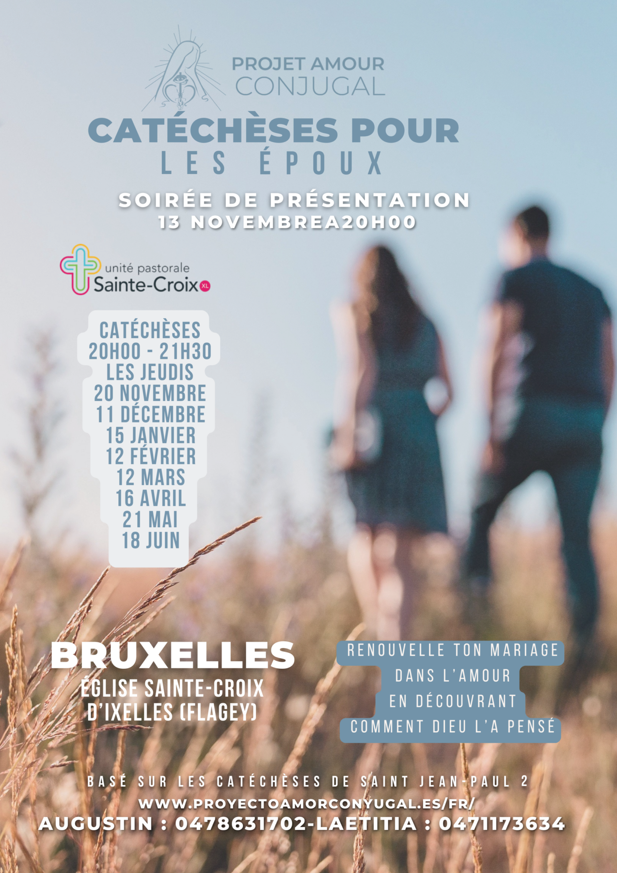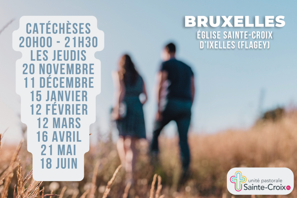 L’Unité pastorale Sainte-Croix d’Ixelles (Bruxelles), propose un nouveau parcours de catéchèses pour les époux à Bruxelles ! Un jeudi soir par mois, basé sur la formation et la prière conjugale, il permet d’approfondir la beauté du sacrement de mariage par une étude progressive des catéchèses de Saint Jean-Paul II sur la théologie du corps.